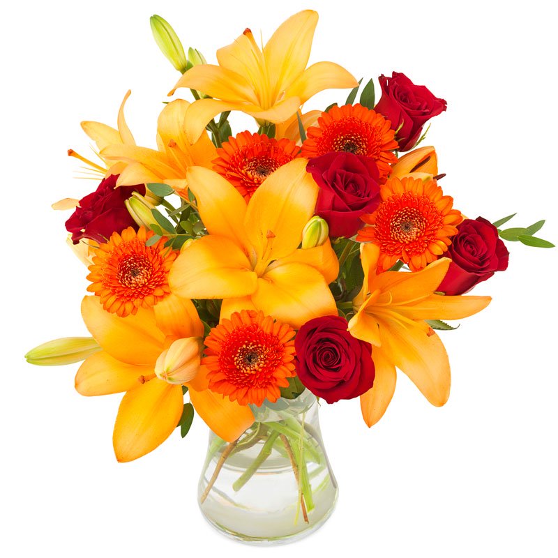 Szukasz sposobu, aby ocieplić jesienny dzień? Wyślij kwiaty w rozgrzewających kolorach! Gerbery, lilie, chryzantemy i róże w czerwonym i pomarańczowym kolorze sprawdzą się w tej roli znakomicie! Do bukietu ułożonego przez lokalną kwiaciarnię Euroflorist, istnieje możliwość dołożenia bileciku z życzeniami. Cena bukietu nie obejmuje wazonu.