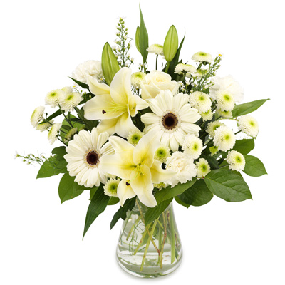 Róże, lilie, gerbery i santinii w białym kolorze to bukiet, który możesz podarować na każdą okazję. W szczególności świetnie się sprawdzi na komuniach i ślubach. Do bukietu przygotowanego przez lokalną kwiaciarnię Euroflorist, jest możliwość dodania bileciku z życzeniami. Wazon nie jest wliczony w cenę.