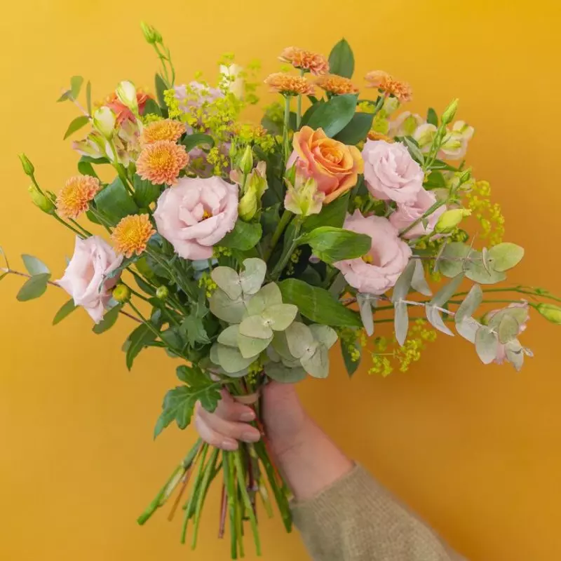 Ciepła kompozycja złożona z delikatnych odcieni różu i brzoskwini, zaprojektowana, by oczarować i zainspirować. Zawiera piękną mieszankę słodkich róż, chryzantem, eustom, alstremerii, innych sezonowych kwiatów oraz zielonych dodatków.