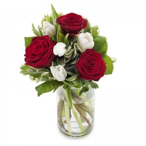 Czerwone róże, białe kwiaty i zielone dodatki tworzą piękny bukiet w klasycznej stylistyce. Idealny na urodziny, imieniny lub bez okazji. Do bukietu ułożonego przez lokalną kwiaciarnię Euroflorist, istnieje możliwość dołożenia bileciku z życzeniami. Cena bukietu nie obejmuje wazonu.