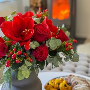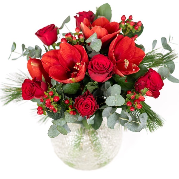 Okrągły bukiet świąteczny z kwiatami takimi jak czerwony amarylis, czerwony hypericum i czerwone róże to klasyczna, elegancka propozycja na Boże Narodzenie. Eukaliptus i zielone gałązki dodają całości świeżości i naturalnego świątecznego charakteru, tworząc ciepłą i efektowną kompozycję na prezent lub dekorację domu. Ponadczasowy, pięknie skomponowany, czerwony bukiet świąteczny w przystępnej cenie – idealny na Boże Narodzenie, Adama i Ewy i wszystkie inne zimowe okazje.