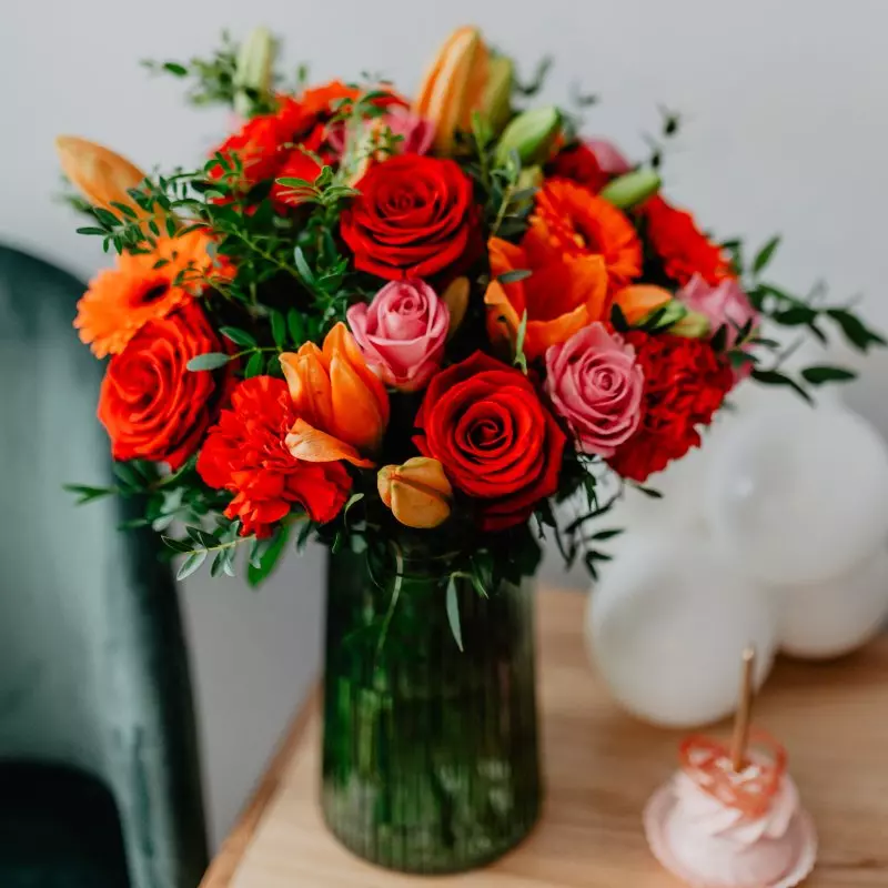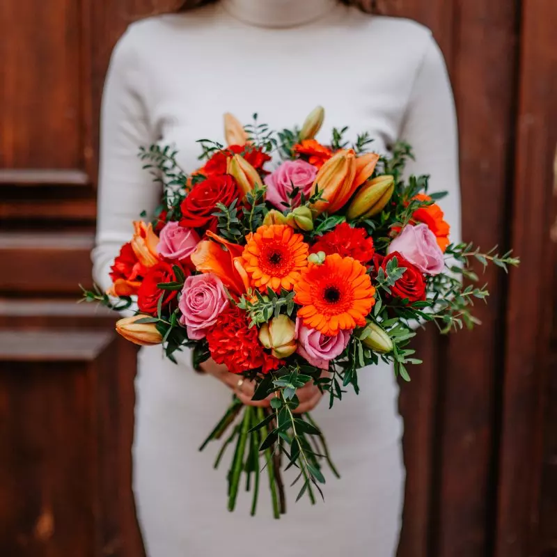 Bukiet w ciepłych kolorach rozgrzeje serce odbiorcy w nawet najbardziej deszczowy dzień! Bukiet, który składa się z lilii, róż, goździków i gerber ułożony będzie przez lokalną kwiaciarnię Euroflorist. Zdjęcie jest poglądowe, przedstawia bukiet w wersji dużej, ilość kwiatów dostepna jest w poniższych wersjach bukietu. Można do niego dołączyć bilecik z życzeniami. Cena bukietu nie obejmuje wazonu.