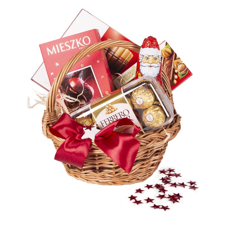 Koszyka wypchanego tak pysznymi słodkościami nie powstydziłby się nawet św. Mikołaj! Merci, Ferrero Rocher, Czekolada Alpen Gold Nussbeiser, Praliny Cherrisimo Mieszko oraz Czekoladowy Mikołaj Figaro to przysmaki, które św. Mikołaj ukrył w tym słodkim koszyczku. Pamiętaj, że koszyk zarezerwowany jest tylko dla tych, którzy byli grzeczni :) Aby sprawić odbiorcy jeszcze większą radość, do upominku warto dołączyć bilecik z wiadomością.